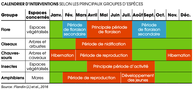 Une gestion écologique passe aussi par une réflexion sur les périodes d’intervention. Chaque écosystème connaît des périodes plus actives ou primordiales que d’autres. Agir au mauvais moment sur votre milieu c’est potentiellement casser le cycle d’une espèce et mettre en péril l’ensemble de la biodiversité qui lui est associé.