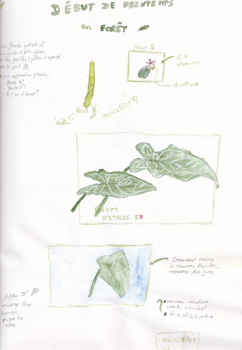 Le nature journaling vient des États-Unis. Il consiste à tenir un carnet ou un journal pour apprendre à observer la nature. Il s’agit de quelque chose de très personnel qu’on utilise pour noter ses observations. Le format est libre, personnellement je privilégie le dessin mais il peut s’agir de notes écrites, de mots, de chiffres, d’un assemblage de notes et de croquis… pas de modèle imposé ! Le principe est simplement de noter ce que vous observez sous la forme qui vous plaît le plus. Le plus souvent, on procède en trois étapes : on commence par noter ses observations, puis on les questionne (pourquoi ce comportement ? pourquoi cette tache sur la feuille… ?), enfin, on revient sur les observations pour répondre à la question. Là encore, c’est très personnel et il n’y a pas de mauvaise façon de tenir son journal.